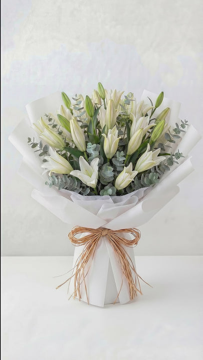 A graceful and elegant bouquet featuring 15 stems of large white lilies, beautifully filled with fresh eucalyptus for a clean and refined finish.