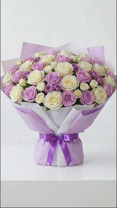 A striking rose bouquet featuring 20 white roses, 20 purple roses, 5 stems of purple spray roses, and 5 stems of white spray roses, beautifully arranged for an elegant and bold presentation.