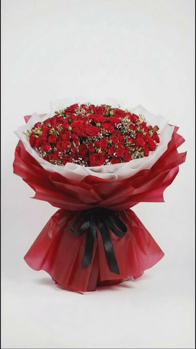 A bold and romantic bouquet featuring 60 stems of red spray roses, accented with baby’s breath and wrapped with white inner wrapping and rich red outer wrapping for a striking finish.