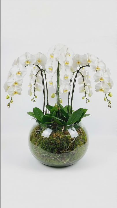 A refined luxury plant display featuring 7 white Phalaenopsis orchid plants, beautifully placed in a large glass bowl with soil, natural moss, and pine bark for a clean and contemporary botanical look.